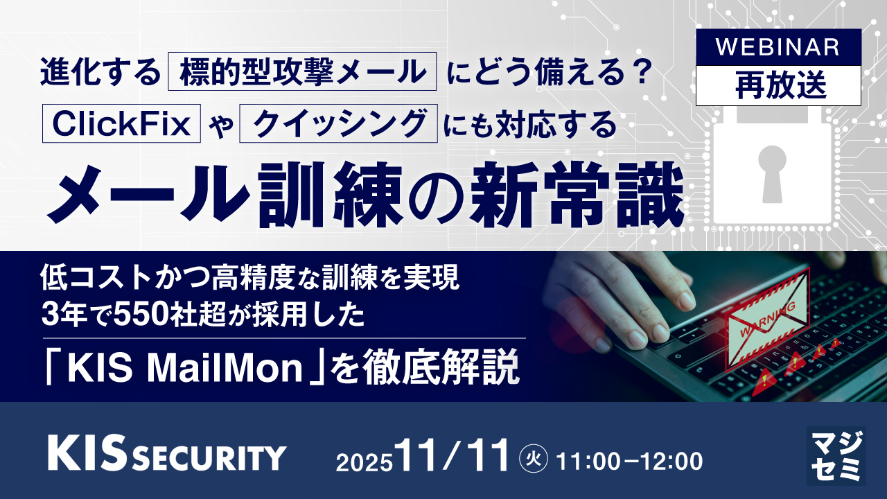 【再放送】進化する標的型攻撃メールにどう備える? ClickFixやクイッシングにも対応するメール訓練の新常識 ~低コストかつ高精度な訓練を実現、3年で550社超が採用した「KIS MailMon」を徹底解説~