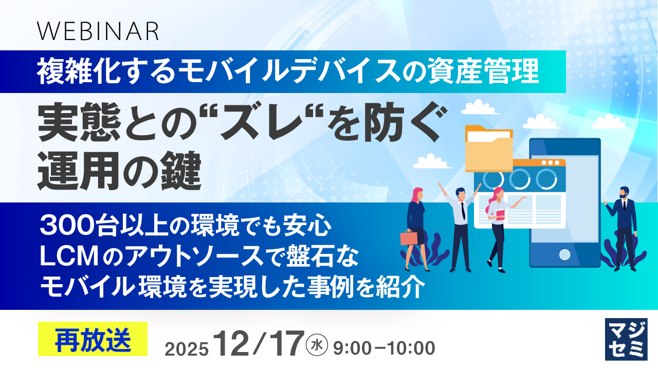 【再放送】複雑化するモバイルデバイスの資産管理、実態との“ズレ“を防ぐ運用の鍵 〜300台以上の環境でも安心、LCMのアウトソースで盤石なモバイル環境を実現した事例を紹介~