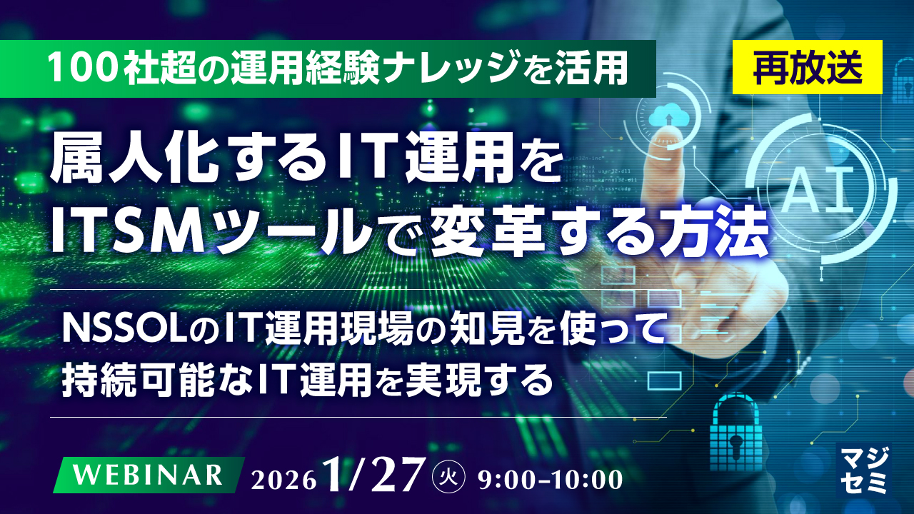 【再放送】【100社超の運用経験ナレッジを活用】属人化するIT運用をITSMツールで変革する方法 ~NSSOLのIT運用現場の知見を使って持続可能なIT運用を実現する~