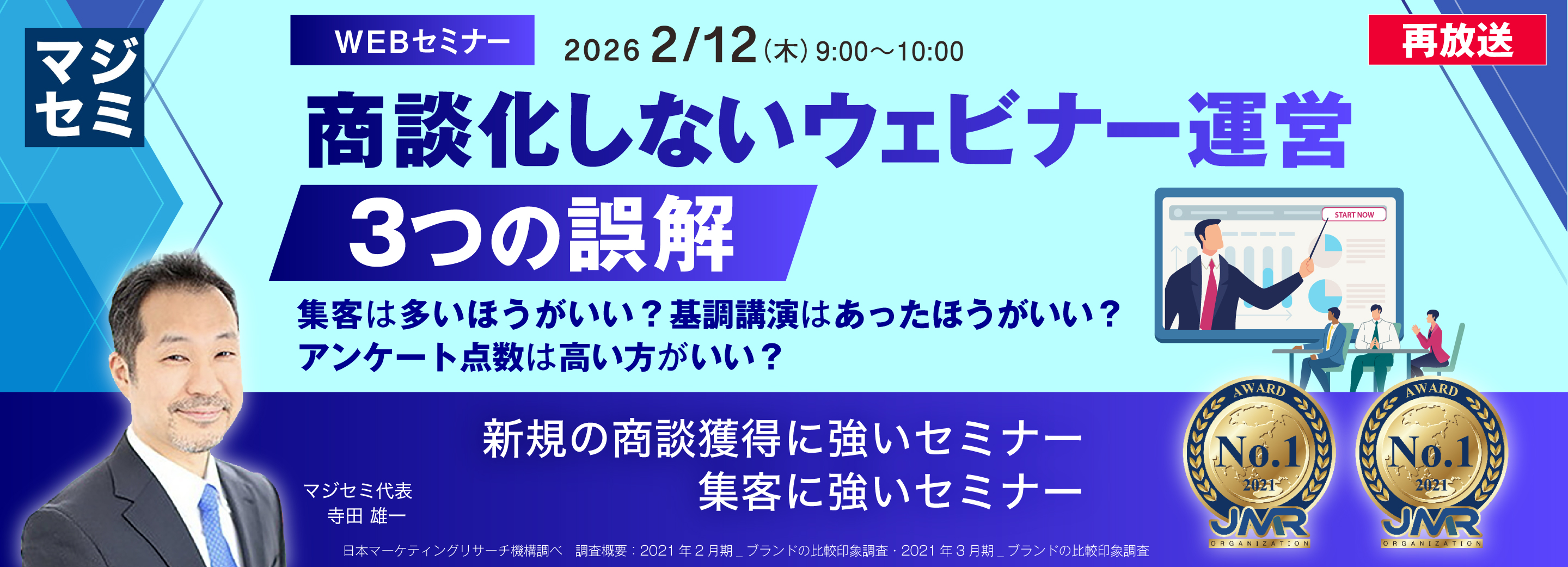 本セミナーでは、年間1,200回以上のウェビナーを支援するマジセミ代表・寺田が、成果に直結するウェビナー運営の本質を明らかにします。「多ければ良い」という量の追求ではなく、どのように質の高いリードを獲得し、商談へとつなげるか。そのために避けるべき“誤解”と、取り入れるべき“運用設計”を具体的に解説します。すでにウェビナーを実施している方はもちろん、これから活用を検討している方にも有益な内容です。