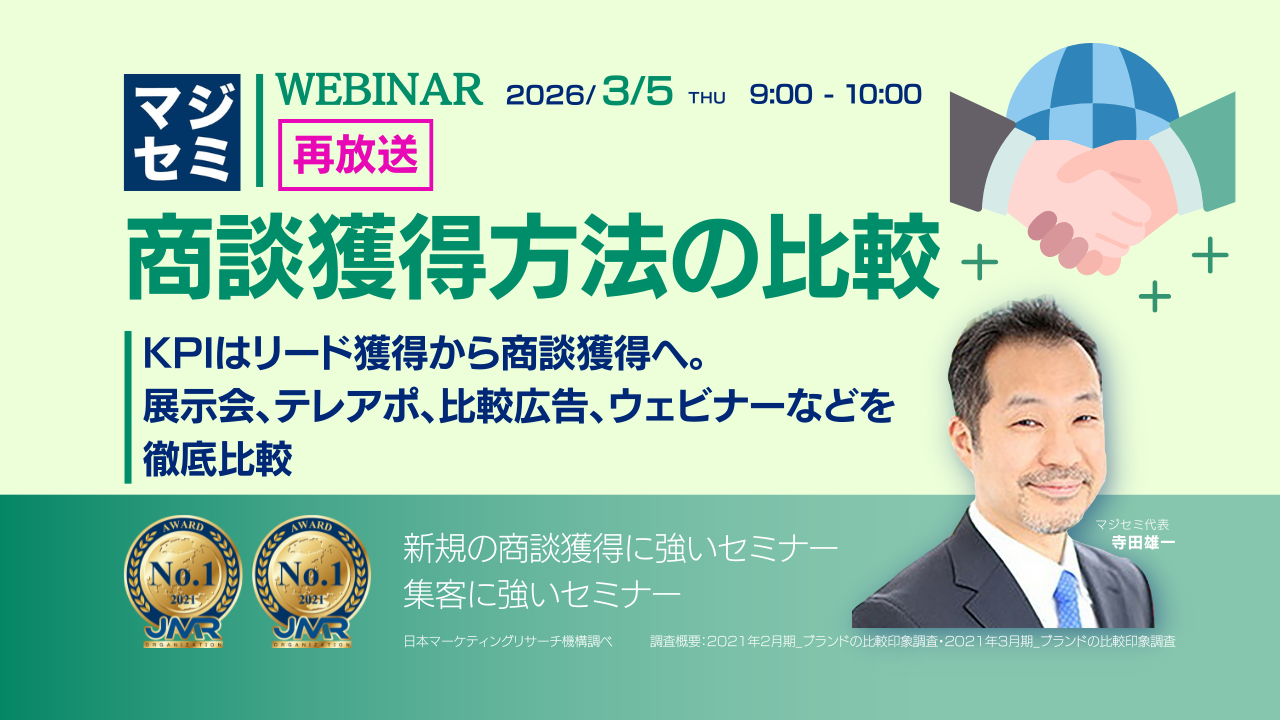 【再放送】商談獲得方法の比較 ~KPIはリード獲得から商談獲得へ。展示会、テレアポ、比較広告、ウェビナーなどを徹底比較~