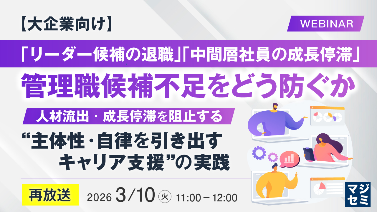 【再放送】【大企業向け】「リーダー候補の退職」「中間層社員の成長停滞」管理職候補不足をどう防ぐか ~人材流出・成長停滞を阻止する"主体性・自律を引き出すキャリア支援"の実践~